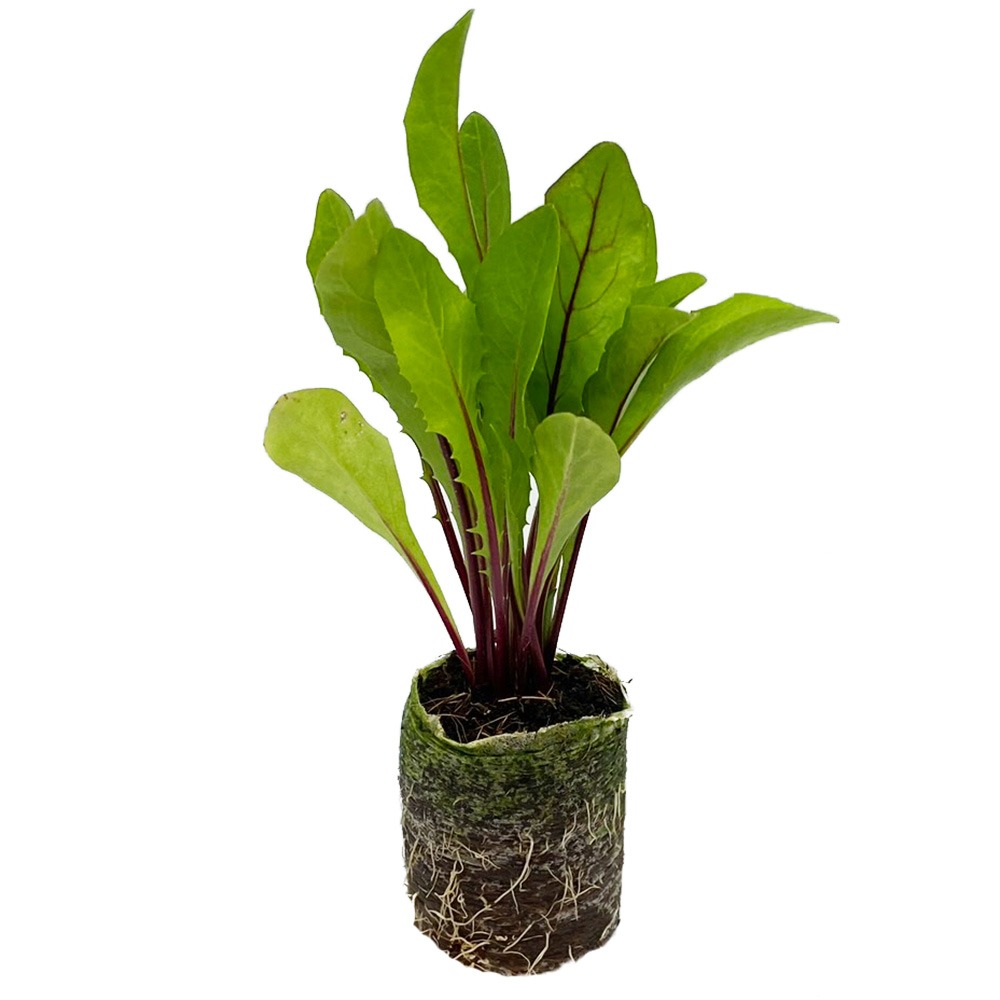Bold red stems and midribs for vibrant contrast. Deeply lobed leaves with classic bitter flavor. Good cold tolerance. Shows some variation in plant habit, leaf shape, and color.