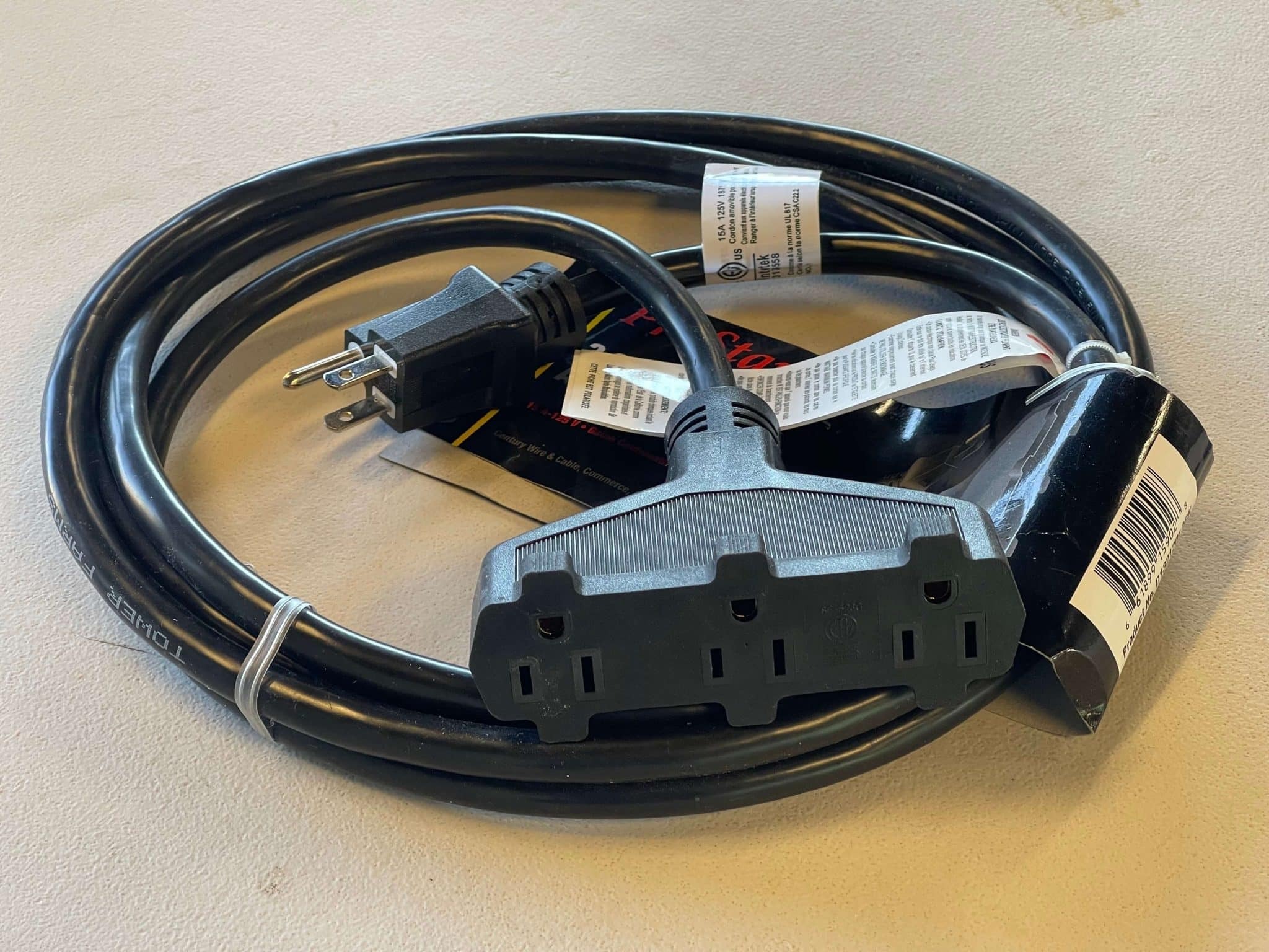 The perfect cord to dasiy chain multiple Towers together for use with one timer. The black, 12-AWG SJTW Triple Tap Extension Cord from Century Wire and Cable is made of soft-drawn, bunch-stranded 100% copper conductors for flexibility. The heavy-duty cord is molded with large strain reliefs at both ends for durability. This 10′ extension cord is manufactured with cold-weather insulating and jacketing compounds. The cord features a triple-tap connector at one end providing three standard 15A-125V outlets for convenient operation.